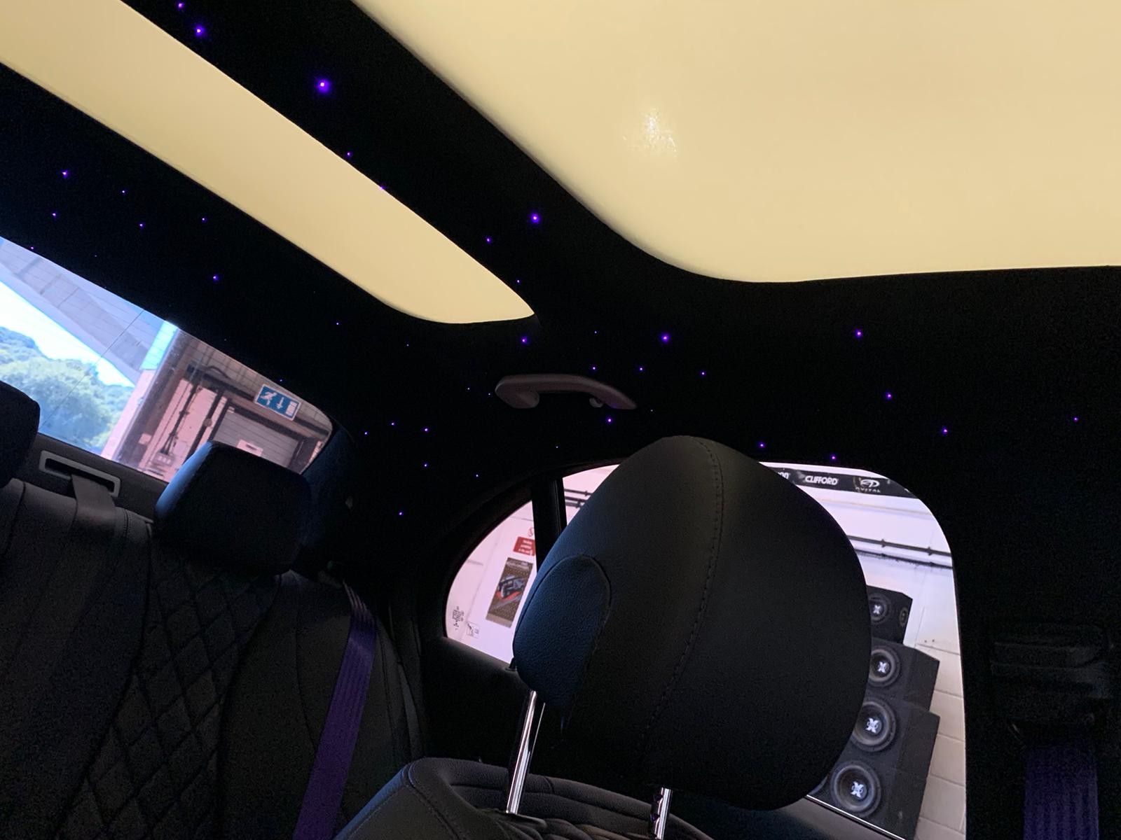 Full Car Interior Customisation – Luxury Interior Design – Bentley Diamond Stitching – Purple Seat Belts – Rolls Royce Starlight Headliner | B&B Audioconcepts Cardiff