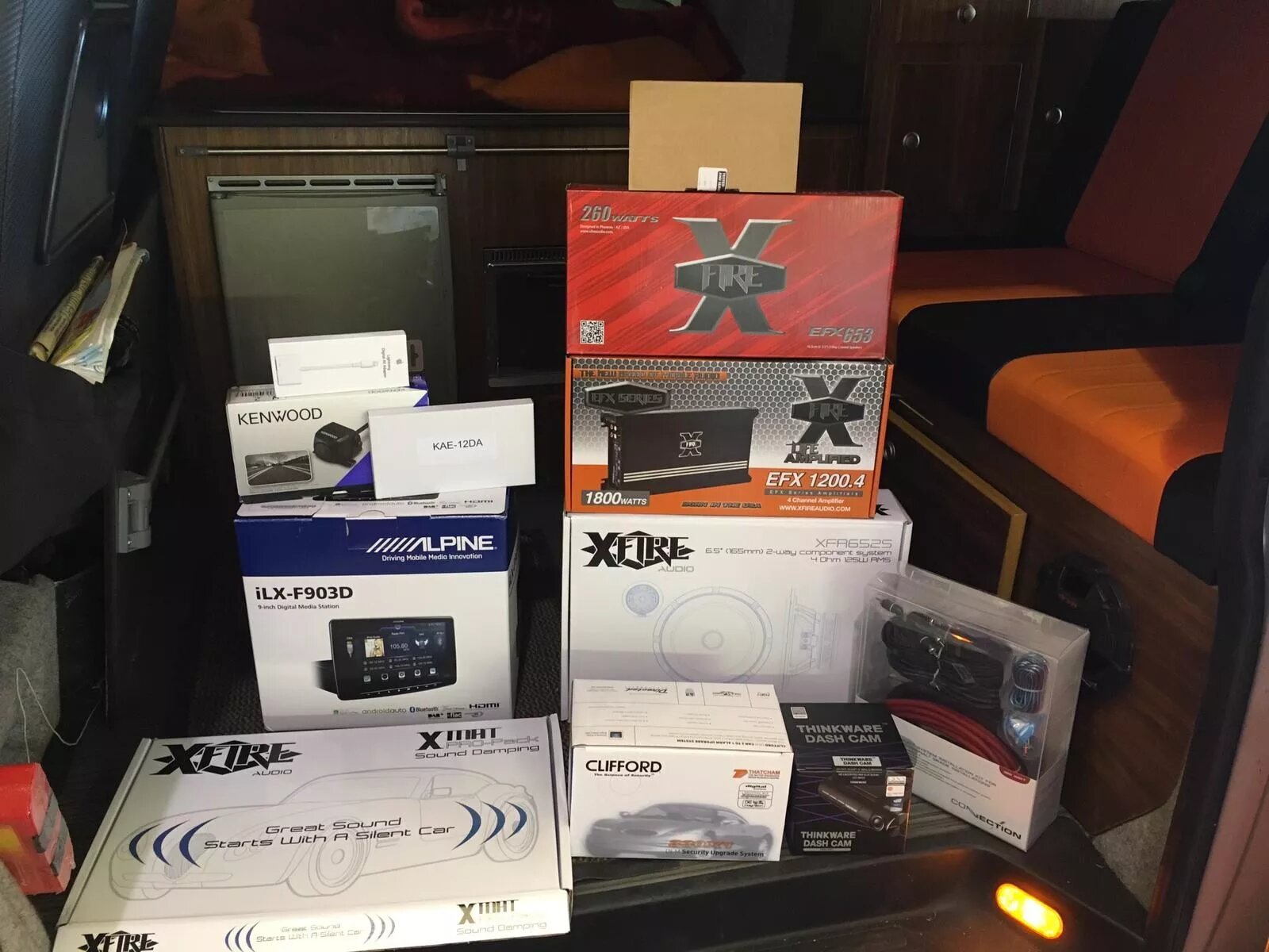 Clifford CAT1 Alarm – Global Telemetrics with Smartphone App (linked to Clifford alarm) – Thinkware F800 Twin Cameras with WIFI – Alpine 9inch Halo Screen – Apple HDMI Connection – Kenwood Rear Camera – XFIRE Reference Speakers – XFIRE Rear Speakers – XFIRE 6inch Subwoofer – XFIRE Amplifier – XFIRE Soundproofing – Custom T5 Subwoofer Enclosure – Connections Cables